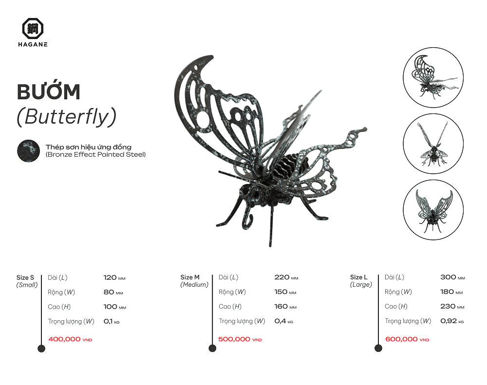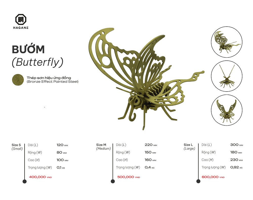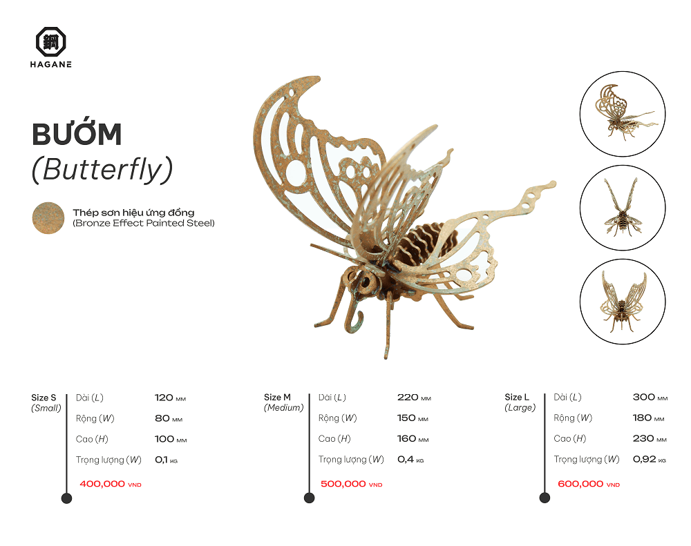 Lấy cảm hứng từ vẻ đẹp mong manh nhưng đầy sức sống của loài bướm, sản phẩm được chế tác từ thép cao cấp, phủ bên ngoài lớp kim loại lỏng màu đồng tạo hiệu ứng ánh kim sang trọng. Bề mặt óng ánh nhẹ dưới ánh sáng, giúp tôn lên từng đường nét tinh tế của đôi cánh.